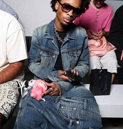 PARIS, FRANCE – JUNE 26: d4vd wears black Chanel sunglasses, diamond stud earrings, white gold diamond choker, silver Chrome hearts necklace, black silver floral beaded oversized Amiri blazer jacket, black baggy trouser pants, shiny black boots leather shoes, outside Amiri, during the Paris Fashion week Men’s Spring/Summer 2026 on June 26, 2025 in Paris, Franco (Photo by Edward Berthelot/Getty Images)