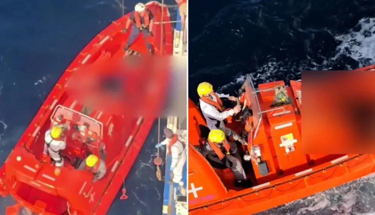 Footage shows the body of a male, in a purple top and black shorts, being pulled into a lifeboat, covered with canvas, and moved onto the ship.