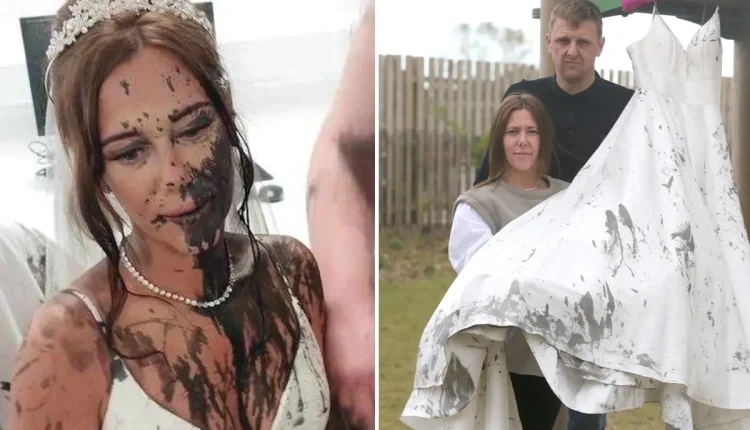 Shocking photos showed the crestfallen bride-to-be with dark, mud-like paint covering the left side of her face and chest and spattered across her white wedding dress.
